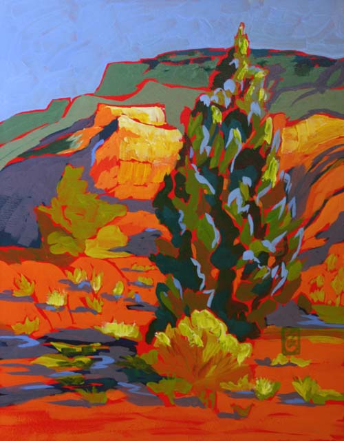 My paintings often include many of the Fauvist ideas. Painting on location, I capture shapes that characterize the place, then look for complementary colors and exaggerate the contrast. In this piece, from Ghost Ranch in New Mexico, the early morning light touched the tops of the cliffs and tips of the trees, while the canyon walls and red dirt road remained in deep shadows. So I enhanced the colors using the contrast of blue with orange and green with red.